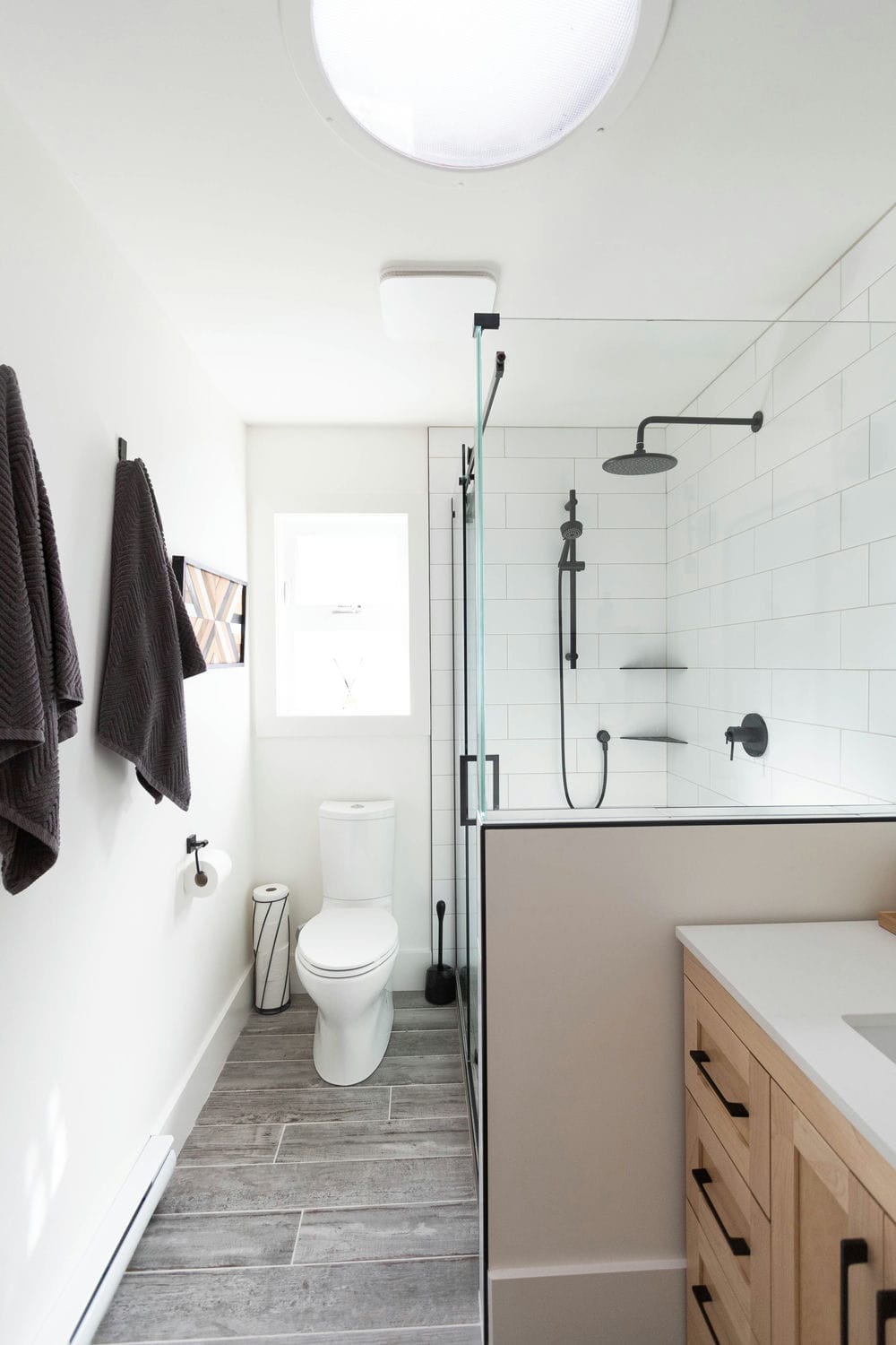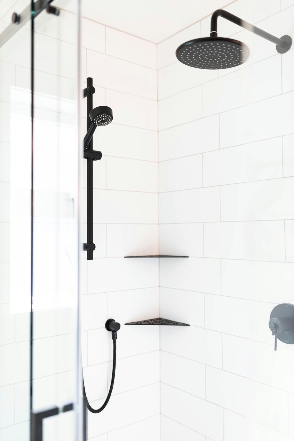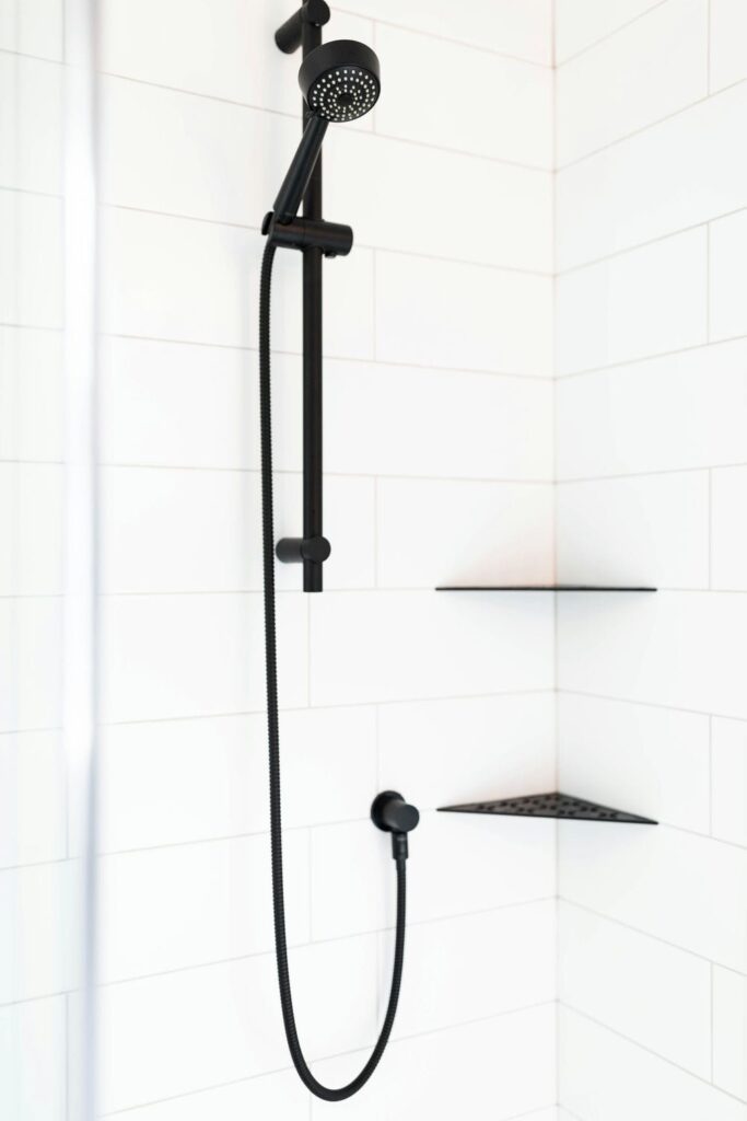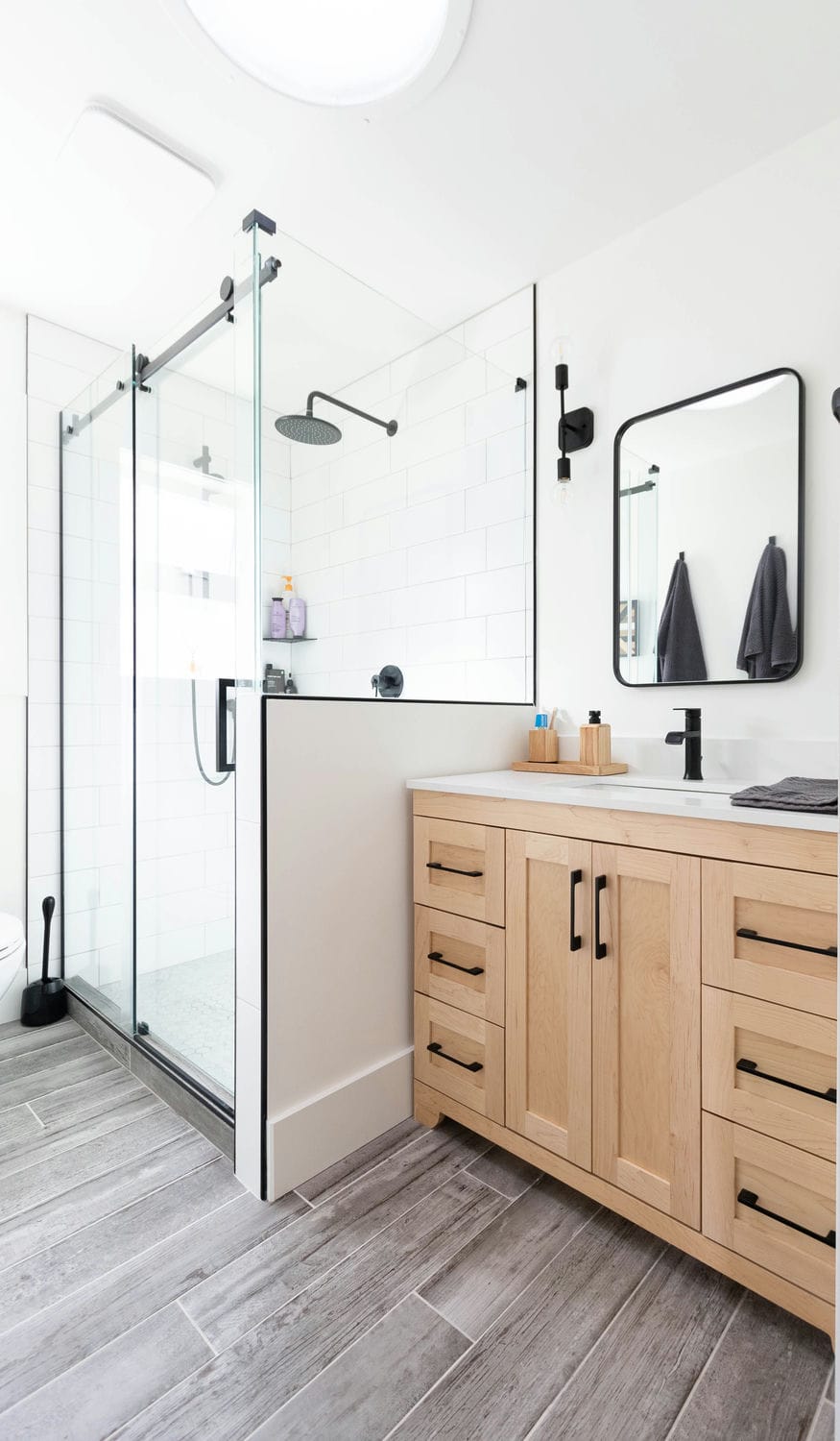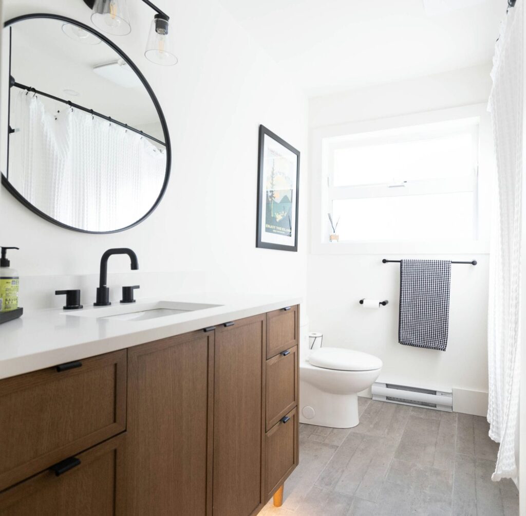 This renovation brought new life to a busy family home, transforming three bathrooms into bright, functional retreats designed for everyday comfort. Our focus was on creating a cohesive sense of calm throughout the spaces — blending natural wood tones, crisp whites, and matte black finishes for a timeless, airy feel.