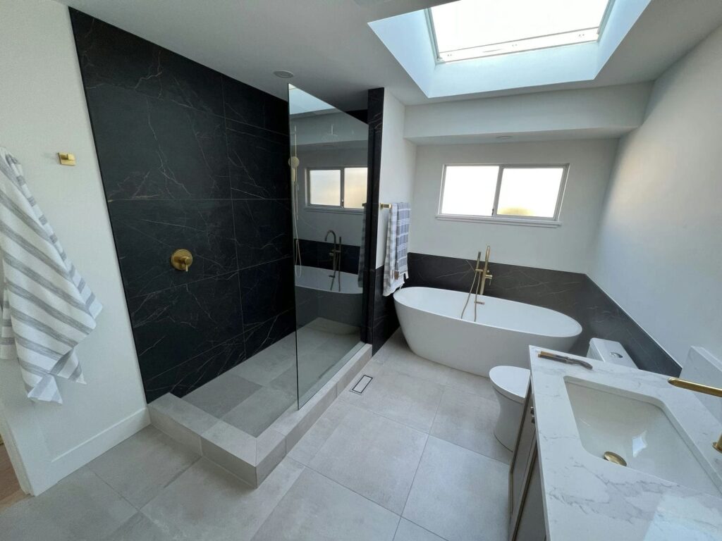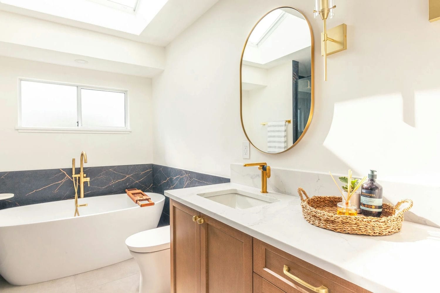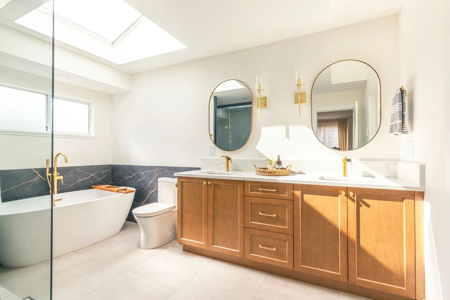 The bathroom continues the refined style with a large bathtub, gold fixtures, and a wood vanity topped with a clean white counter. Oval gold-framed mirrors and matching wall lights add elegance, while a skylight and window flood the space with natural light. A dramatic backsplash with gold veining behind the tub adds depth and contrast.
