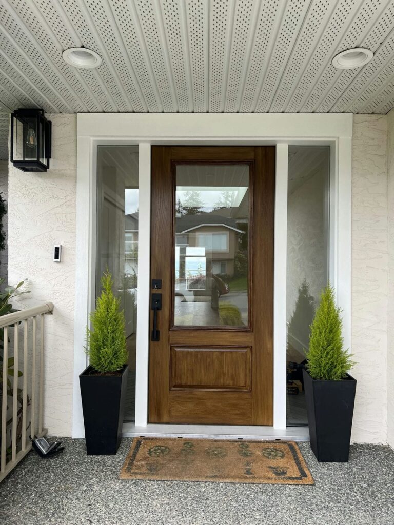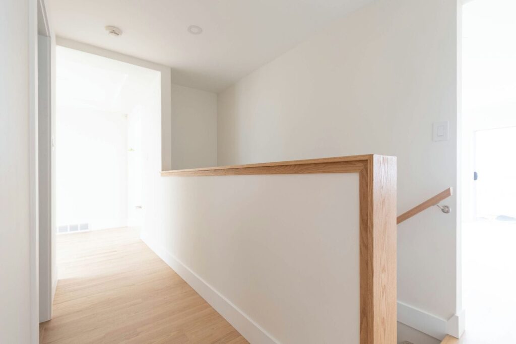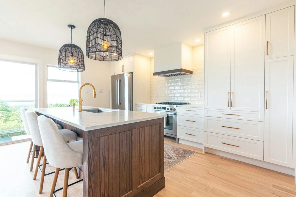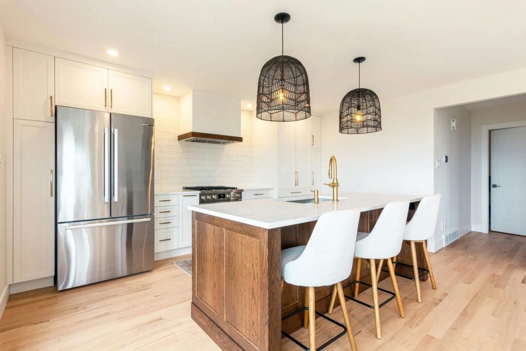This project blends modern elegance with functional design. The kitchen features a spacious island with a white countertop, warm wood base, and light gray bar stools. Black wire pendant lights and crisp white cabinetry with gold handles add a touch of sophistication, while stainless steel appliances and a glossy subway tile backsplash complete the look. A pop of color from a potted plant brings warmth and life to the space.